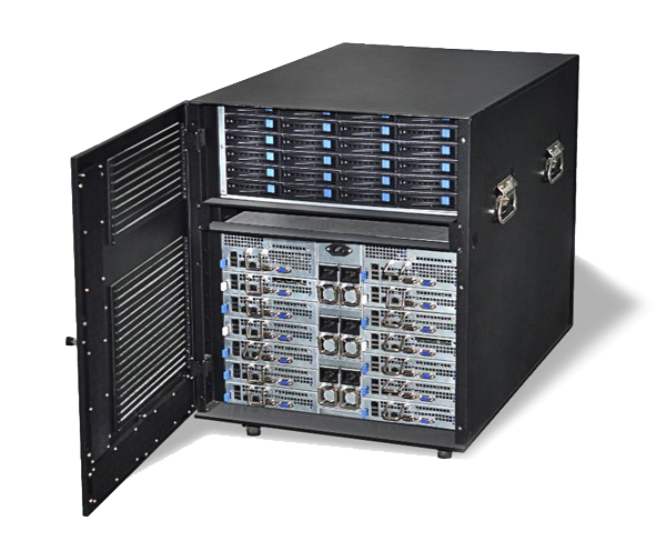 BWIN必赢国际融合一体机就是解决环境使用问题而推出的综合性计算产品,它不需要专业的机房设施,不需要专业的配电和空调设备,放在办公室或实验室接墙电就可使用, 具有低噪音、低功耗等特点。最高可以安装14个双路XEON E5 处理器的刀片服务器,48个外置热插拔硬盘存储,内置一个万兆网络交换机安装空间,带有整体状态显示和控制系统,内部散热和防尘处理。专为办公室应用环境 设计,它在众多方面超越了传统机架式服务器、刀片服务器和机群服务器,是高稳定、高性能、低环境要求的新一代桌边型高性能计算机。它采用整体优化的设计, 有效降低了系统功耗,再加上其人性化的设计、很强的系统扩展能力、卓越的性价比和计算密度,可以覆盖更广泛的个人及工作组用户对高性能计算的需求,与传统 的高性能计算机相比,BWIN必赢国际融合一体机可给予更有竞争力的整体解决方案,是更好满足中小高性能计算需求的理想平台。下图为14个刀片打开效果图: